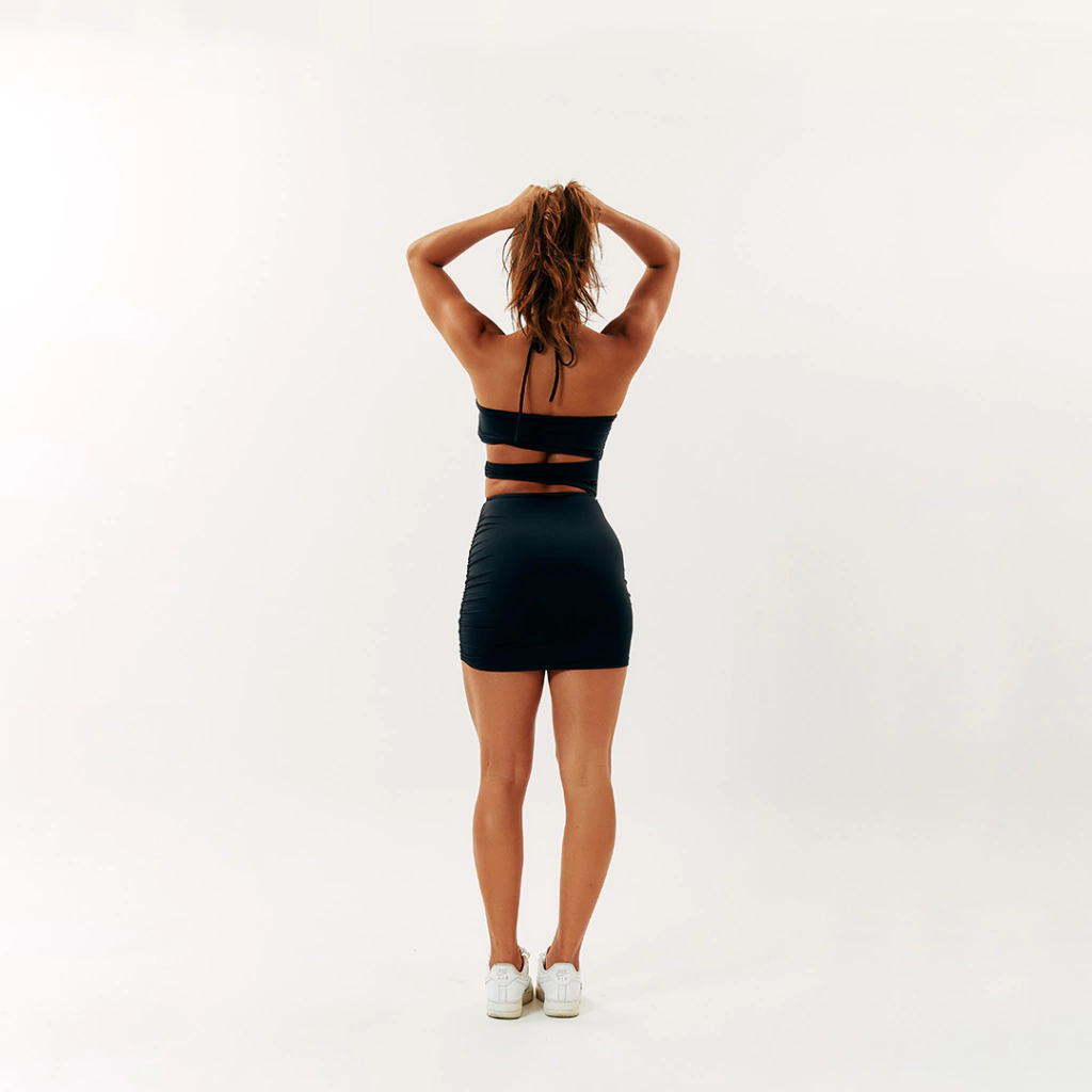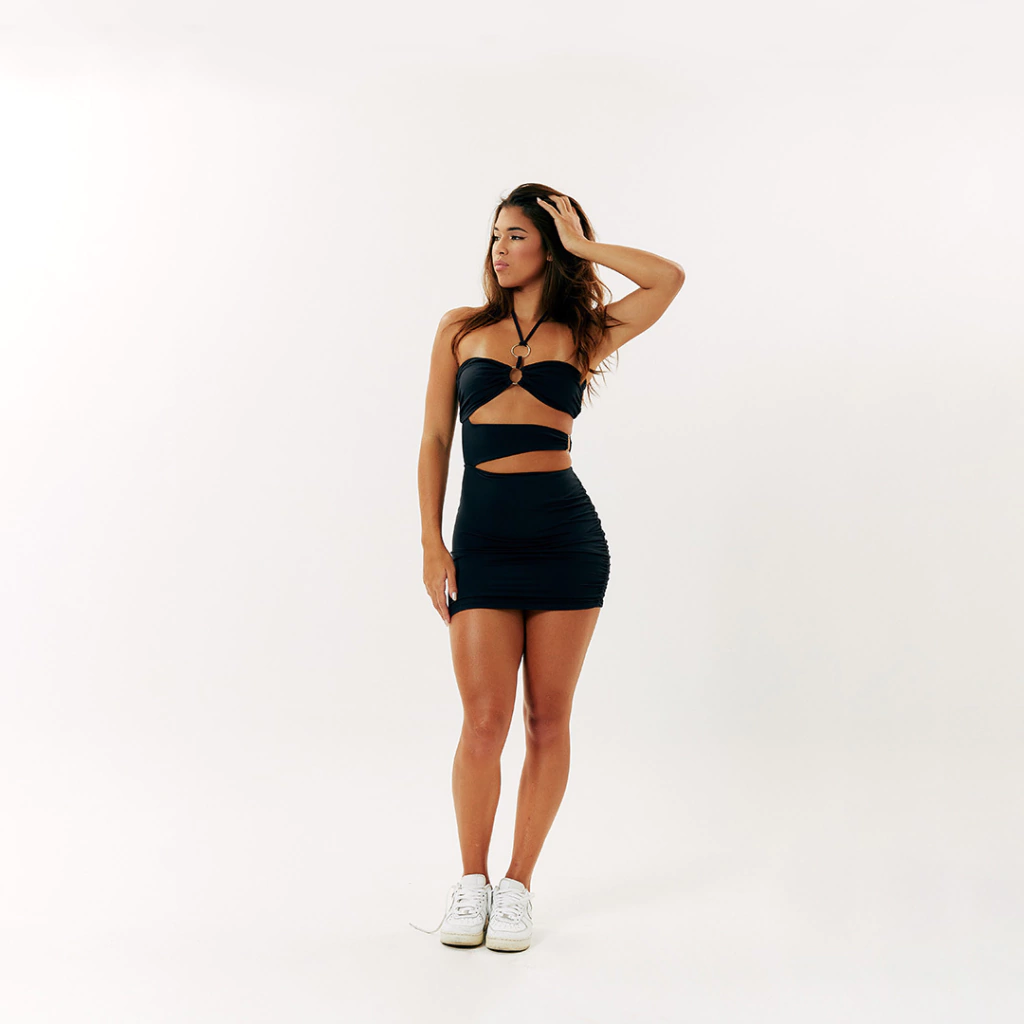Dica da Let: Eu adoro combinar o Gigi com um belo par de saltos altos para uma noite incrível. A amarração no pescoço é um destaque, e os recortes na cintura realmente modelam o corpo. Vai lá e arrase com confiança e estilo!
